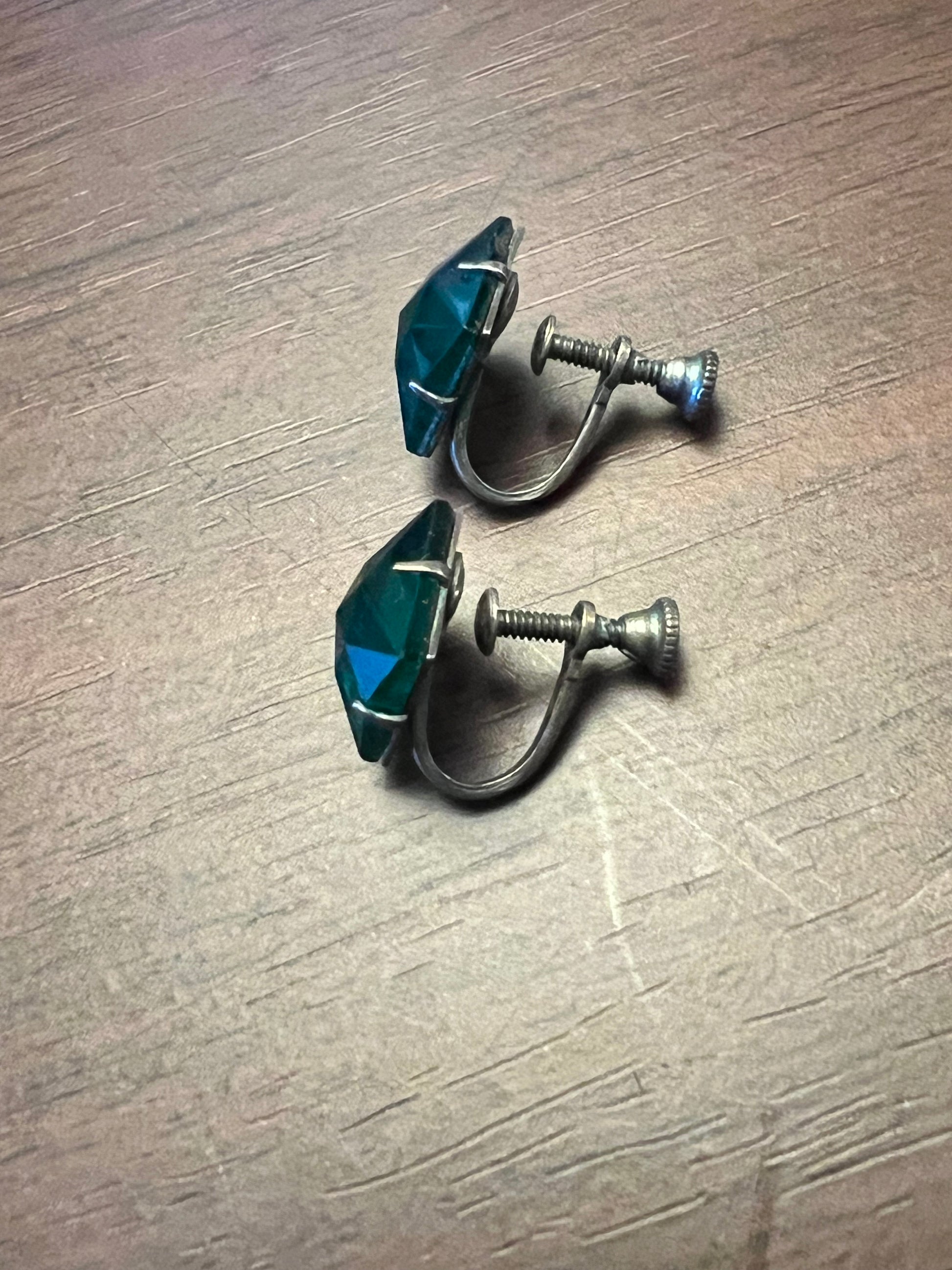 Elevate your style with these stunning emerald cut green rhinestone earrings. Crafted with sterling silver screw backs, these vintage earrings from the 1940s add a touch of elegance to any outfit. While they may have a slight patina due to their age, they are in good condition and are sure to make a statement.