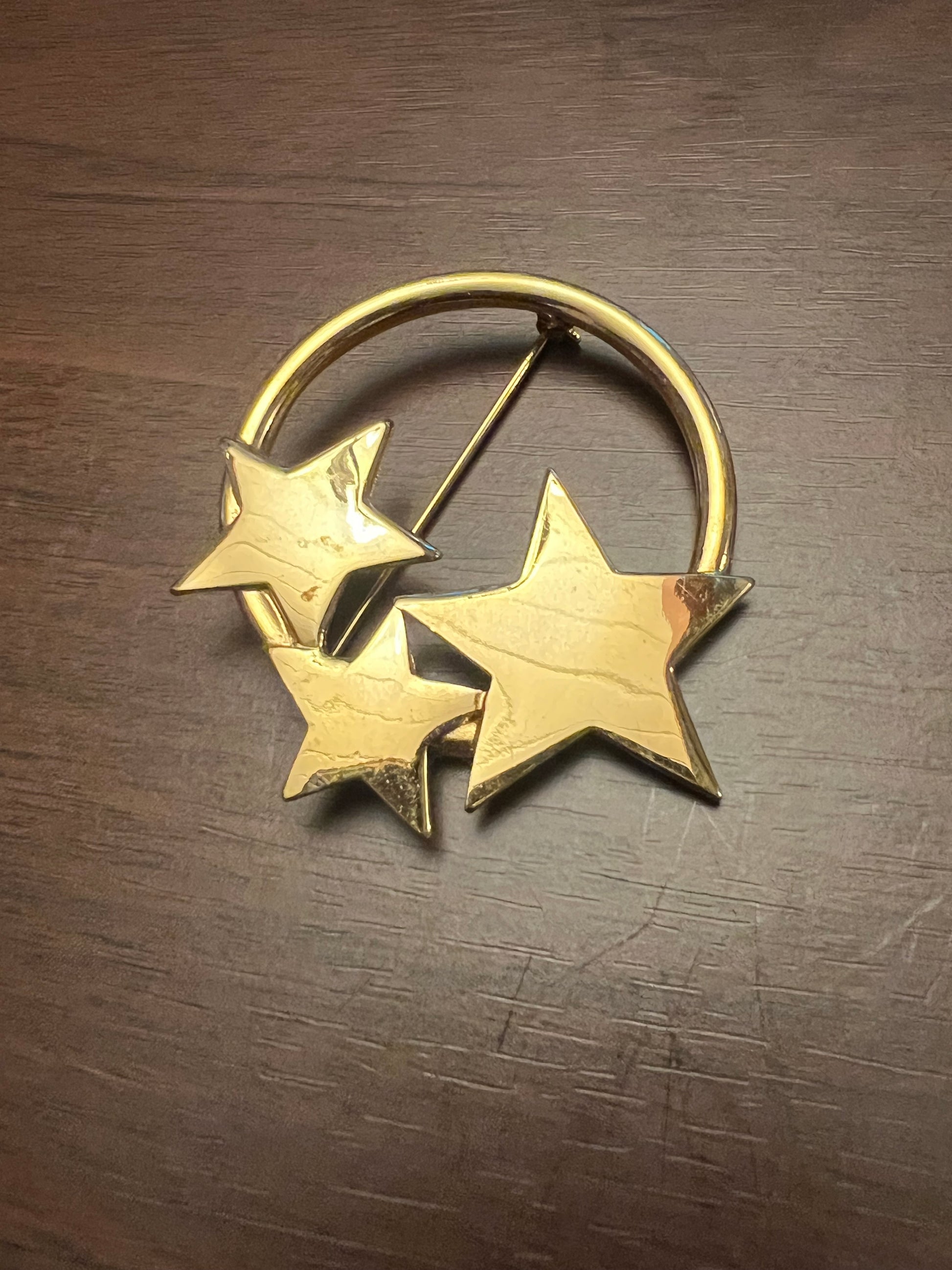 This vintage gold-toned star brooch from the 1980s is a must-have for any jewelry lover. Its unique design and good condition make it a standout piece. Add some vintage charm to your outfit with this timeless accessory.