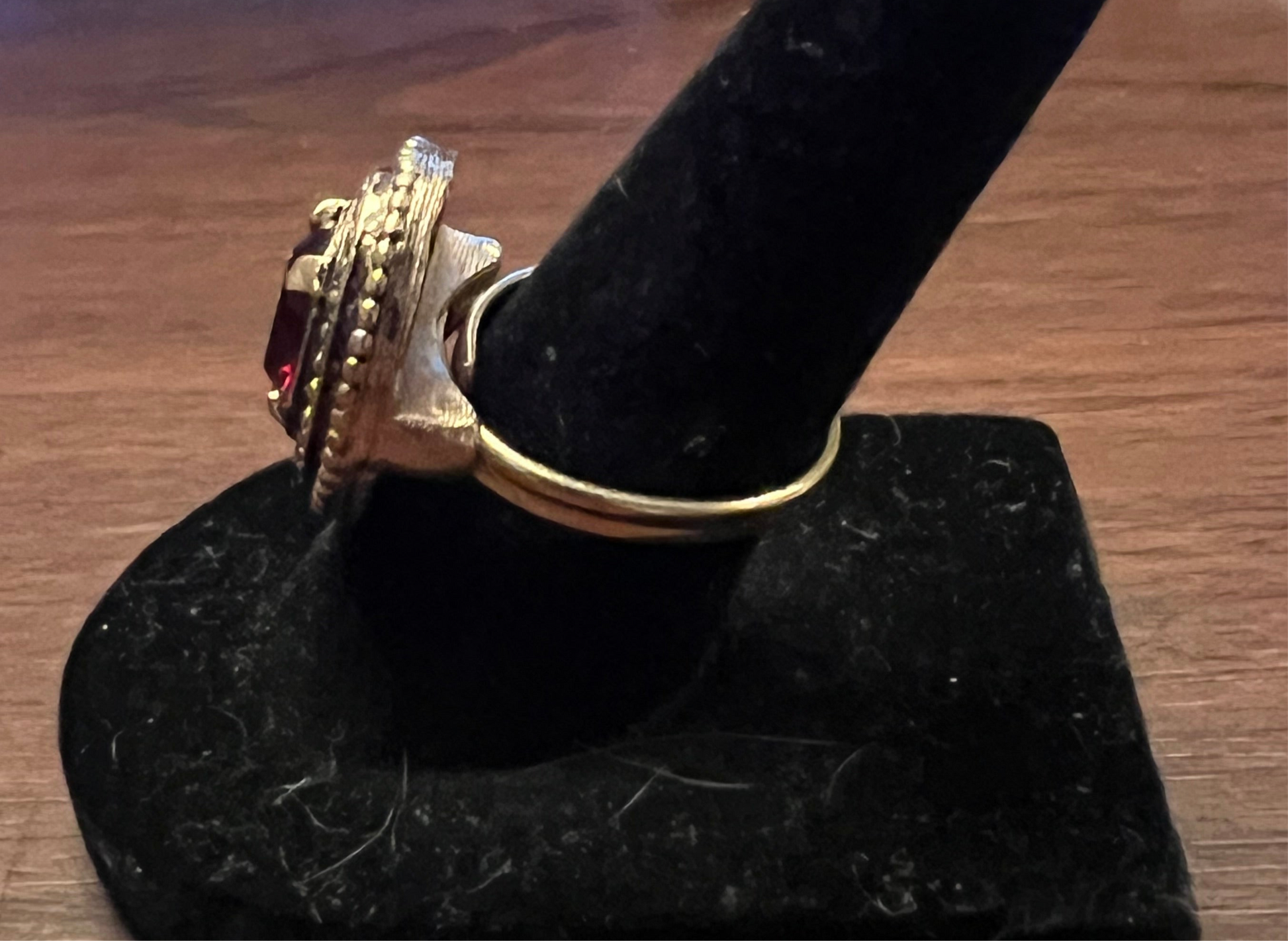 Elevate your style with the vintage charm of the Sarah Coventry "Coronation" ring. This beautiful ring features a bright red faceted rhinestone set in an antiqued gold-tone setting, adding a touch of elegance to any outfit. Its adjustable design allows for a perfect fit every time. Bring back the timeless glamour of the 1960s with this stunning ring.